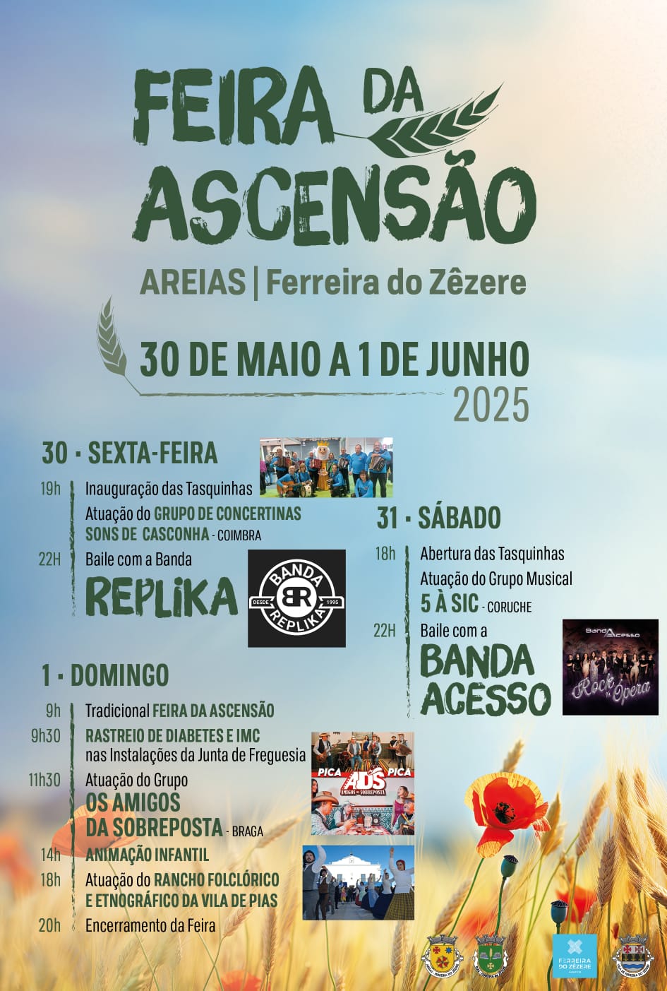 O evento arrancou com a inauguração das tasquinhas, seguida da atuação do Grupo de Concertinas Sons de Casconha, de Coimbra. À noite encerrou com um baile animado pela Banda Réplika, pelas 22h. No sábado, dia 31, as tasquinhas voltaram a abrir pelas 18h, com música a cargo do grupo 5 à SIC, de Coruche. Às 22h, a animação continuou com a Banda Acesso. O domingo, 1 de junho, começou cedo com a tradicional Feira da Ascensão, pelas 9h.